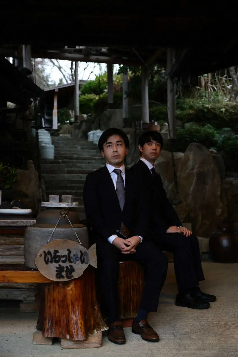 会場の大幸園で記念撮影に臨む菅井八段(左)と藤井王将(撮影・大城 有生希、西尾 大助、光山 貴大、藤山 由理)