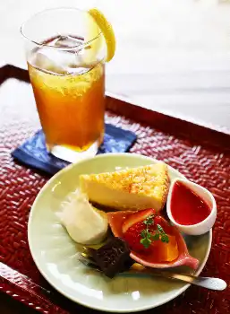 ≪18年考案チーズケーキも≫藤井は昼食に、大幸園提供の「陶板ハンバーグ」を食べた。牛肉と豚肉の合いびきでハンバーグに加えジャポネソースにも佐賀県白石町のタマネギが使用された。午後のおやつには「ベイクドチーズケーキ」とアイスレモンティーをオーダー。ベイクドチーズケーキは、同所で初めて王将戦が開催された2018年の第67期王将戦に合わせて考案された一品。