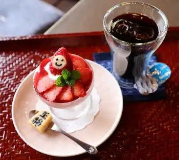 ≪午後のおやつに“いちごさん”≫藤井は午前のおやつに「“いちごさん”のムース」とアイスコーヒーを注文した。“いちごさん”のムースは昨年、同所で行われた王将戦第6局1日目の午前のおやつで食べており、同じシチュエーションで2年連続のオーダー。22年の祝賀会で訪れた際にも食べており“3年連続”とお気に入りの様子だ。甘さとみずみずしい果汁が特長の佐賀県のブランドいちご「いちごさん」をふんだんに使用し、「王将」の駒に見立てたクッキーも添えられた。ムースは砂糖控えめで、いちごの甘みを味わえるように工夫されている。