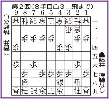 飛車を振らせたら右に出る者はない、第一人者としての意地なのか。なんらかの確信を背景とした必然策なのか。菅井の8手目は3二飛(第2図)。エース戦法と呼ぶべき三間飛車が、またもや盤上に再現された。