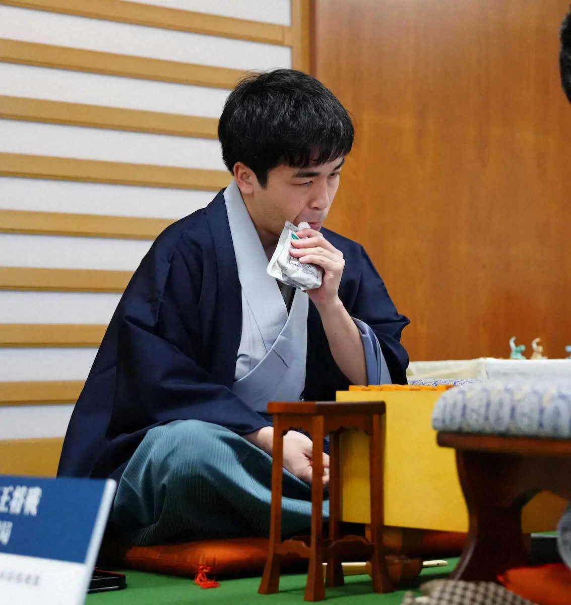 ゼリー飲料を飲む菅井八段(撮影・光山 貴大、西尾 大助、大城 有生希、藤山 由理)