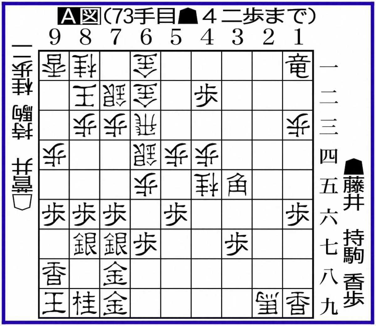 対する藤井の指し手は自然で▲2四歩から竜をつくり香車を補充。さらに▲7五歩△同銀▲7六歩と手堅く自陣の憂いを取り払う。鉄壁の陣形を整えて指された▲4二歩(A図)が確実な一手で優勢を確かなものにした。
