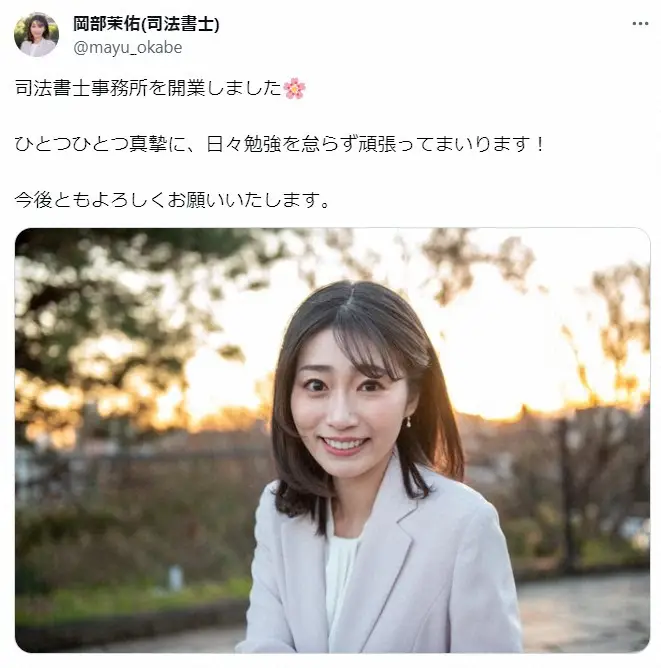 この日、岡部さんは「司法書士事務所を開業しました」と報告。「ひとつひとつ真摯に、日々勉強を怠らず頑張ってまいります!」と意気込み、写真を添え決意を新たに。「今後ともよろしくお願いいたします」と呼びかけた。