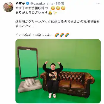 「やす子の新番組撮影中」と書き始め、緑のスタジオでポーズを取っている写真を投稿。