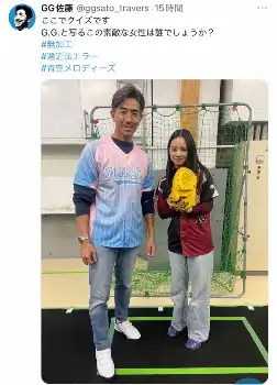 G・G・佐藤氏は「ここでクイズです」とフォロワーにクイズを出題し、「G.G.と写るこの素敵な女性は誰でしょうか?」とグラブを手に持つ女性との写真を投稿。
