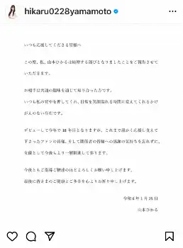 山本は「いつも応援してくださる皆様へ」として文書を投稿。「この度、私、山本ひかるは結婚する運びとなりましたことをご報告させていただきます」と報告した。