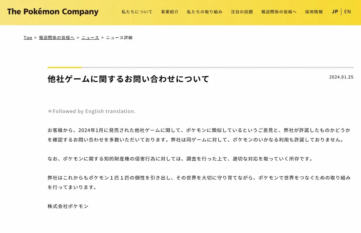日本語と英語で掲載。「お客様から、2024年1月に発売された他社ゲームに関して、ポケモンに類似しているというご意見と、弊社が許諾したものかどうかを確認するお問い合わせを多数いただいております」とした上で「弊社は同ゲームに対して、ポケモンのいかなる利用も許諾しておりません」と記した。