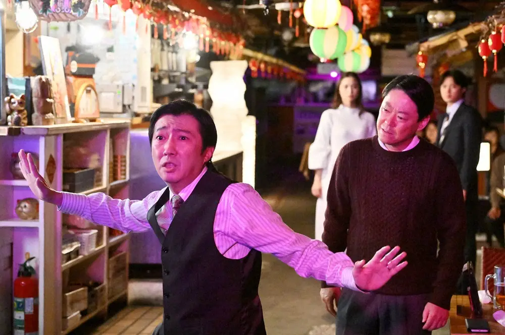 金曜ドラマ「不適切にもほどがある!」第1話。歌い、踊る小川市郎(阿部サダヲ・左)と秋津睦実似の男(磯村勇斗)(C)TBS