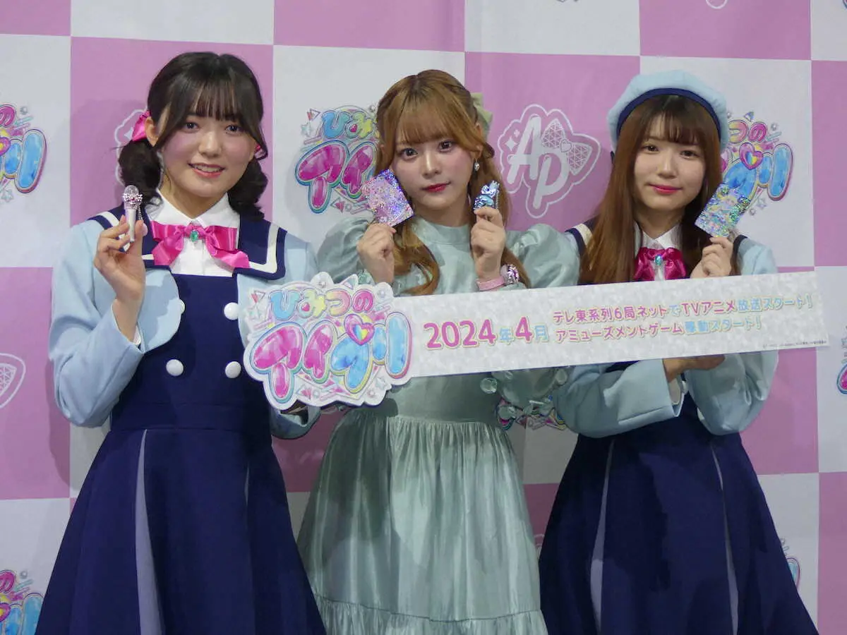 人気アニメ・プリティーシリーズの新作「ひみつのアイプリ」のプロジェクト発表会に出席した、左から、藤寺美徳、齊藤なぎさ、平塚紗依