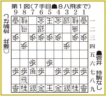 「棋士になって一番の恥。でも自分にとっては必要な恥でした」とポジティブ思考で臨んだ今局の7手目、2八の飛車をひょいとつまんで8八へと配置する(第1図)。いわゆる「向かい飛車」の立ち上がり。藤井相手のタイトル戦では8戦連続して三間飛車をぶつけたが、9戦目にして初めて趣向を変えた。タイトル戦だけではなく、17年8月の王将戦1次予選で初対決以来、16局目にして初の戦型だ。