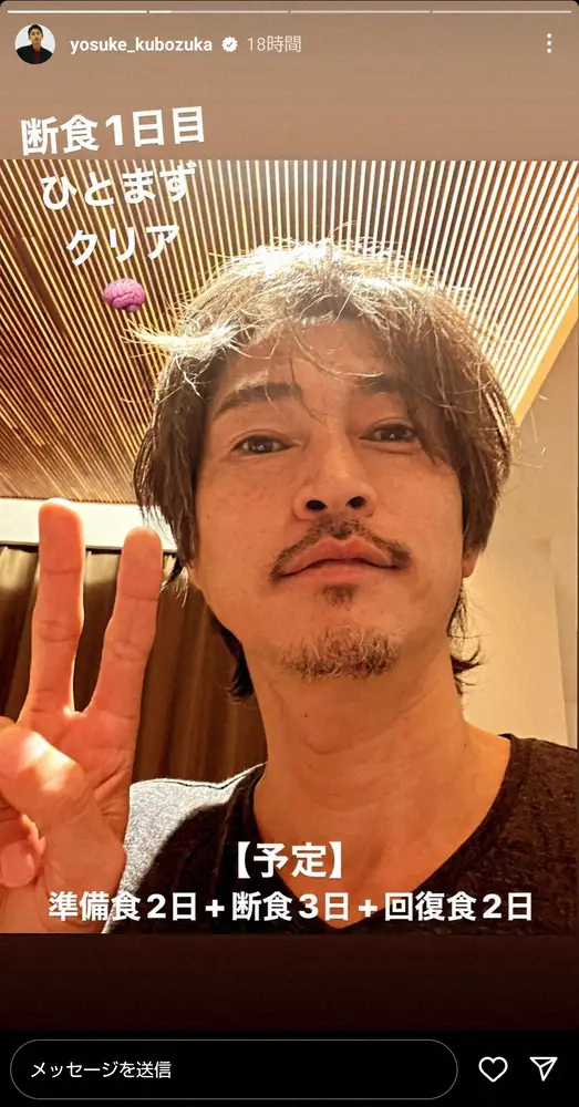 窪塚は「断食1日目ひとまずクリア」とコメント。「予定」として「準備食2日+断食3日+回復食2日」というスケジュールを明かした。