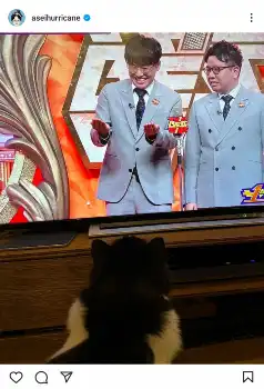 亜生は「ご飯もらえると、思ってるのかな?」とコメント。「邦画とミョウガ、どっちが好き?」などと畳みかける漫才ネタをテレビ番組で披露する自身の姿に、愛猫「兆猛」が釘付けになっている様子を掲載した。