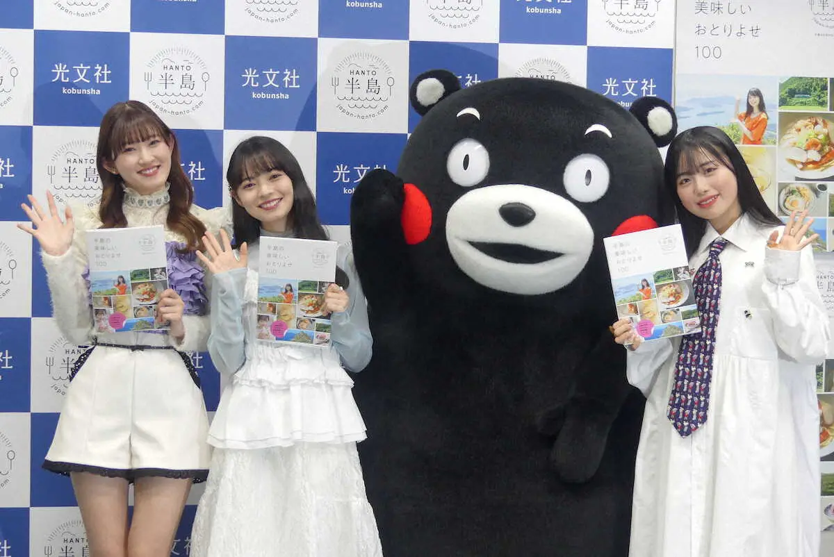「半島の美味しいおとりよせ100」の刊行記念発表会を行ったくまモンとアンジェルム(左から)川村文乃、上國料萌衣、伊勢鈴蘭