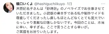 橋口いくよX(@hashiguchiikuyo)から 芦原さん「砂時計」ノベライズ版作家・橋口いくよ氏 「私や制作サイドを… ギャラリーで見る この記事のフォト 2024年01月31日の画像一覧 もっと見る 2024年01月31日の画像をもっと見る