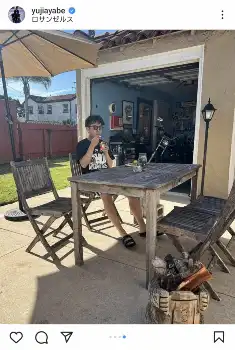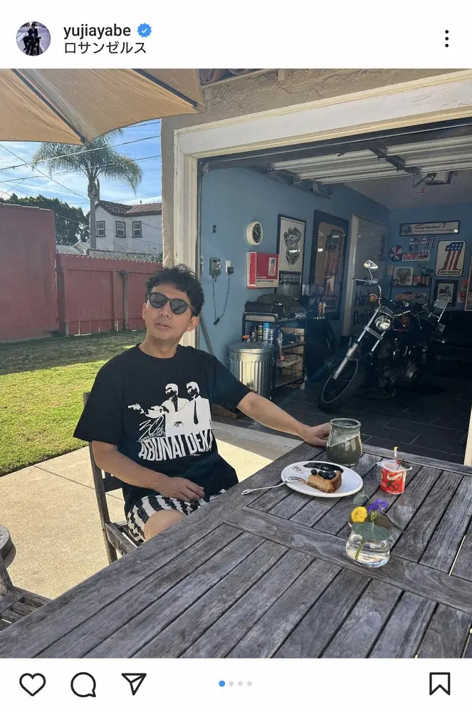 米LA拠点の綾部祐二 オシャレなガレージ前でくつろぐ“ブランチ”ショットに「羨ましい」の声