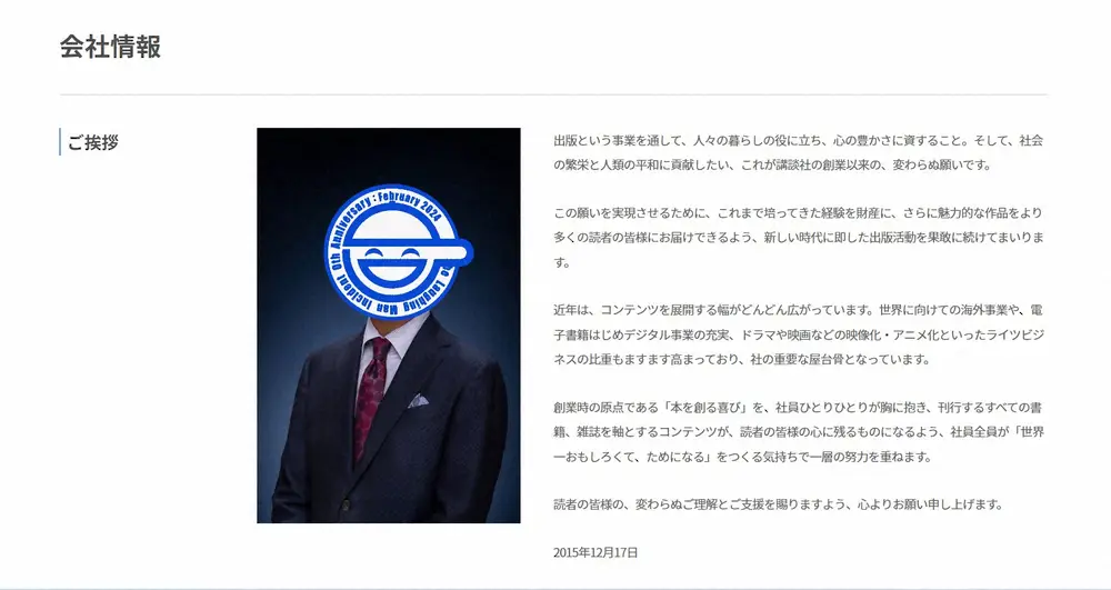 講談社公式X(@KODANSHA_JP)から えっ?乗っ取り? 講談社公式サイト、社長の顔写真にスタンプ…一体何が … ギャラリーで見る この記事のフォト 2024年02月01日の画像一覧 もっと見る 2024年02月01日の画像をもっと見る