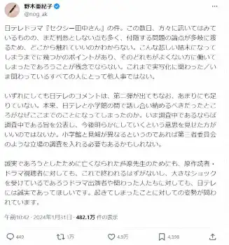野木氏は自身のSNSで今回の件に触れ、調査の必要性を訴えた。「本来は日テレと小学館の間で話し合いを収めるべきだった。なぜここまでのことになってしまったのか」と対応を疑問視。日テレに対して「調査中であるならば調査中である旨を公表し、今後明らかにしていくという意思を見せた方がいいのではないか」と訴え「小学館と見解が異なるというのであれば第三者委員会のような立場の調査を入れる必要もあるかもしれない」と全容の解明を求めている。