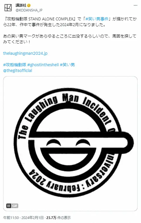 同社は同日、公式X(旧ツイッター)で「『攻殻機動隊 STAND ALONE COMPLEX』で『#笑い男事件』が描かれてから22年、作中で事件が発生した2024年2月になりました。あの笑い男マークがあらゆるところに出没するらしいので、周囲を探してみてください!」と告知。