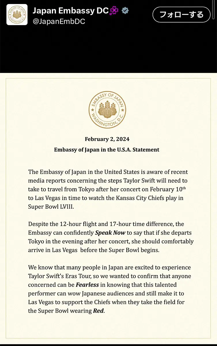 在米日本大使館は3日までに公式X(旧ツイッター)を更新。人気歌手テイラー・スウィフト(34)が日本時間10日の東京公演後、11日に米ラスベガスで行われるプロフットボールNFLの王者決定戦・スーパーボウルを現地観戦できるとの異例の声明を出した。