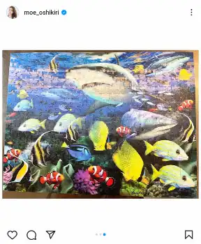 「パパの出発前に連れて行ってくれた水族館で一緒に選んだという500ピース」と解説、「私と夫の趣味で、うちにあるおもちゃは知育系ばかりです」と明かした。
