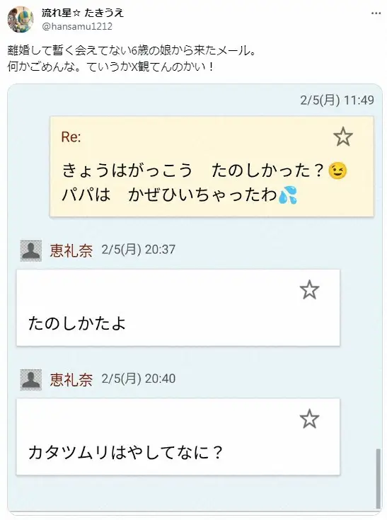「流れ星☆」のたきうえこと瀧上伸一郎 Photo by スポニチ 流れ星・たきうえ「離婚して会えてない」7歳長女とのほっこりメール公開 … ギャラリーで見る この記事のフォト 2024年02月06日の画像一覧 もっと見る 2024年02月06日の画像をもっと見る