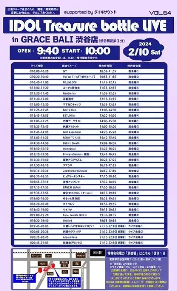 レコード会社「ダイキサウンド」が主催する大型アイドルイベント「IDOL Treasure bottle」が10日にグレースバリ渋谷店で開催される。