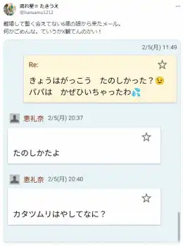 たきうえは「何かごめんな。ていうかX観てんのかい!」としみじみ。この投稿には「娘ちゃん面白すぎる 6歳でも愛があるイジりがわかってるわ」「お父さんが大好きなんですね」「さすが芸人の娘」「娘からのメール、心が温かくなりますね」と、さまざまなコメントが寄せられた。また、小林側が過去にSNSで主張した「養育費が払われない」という点に関する声に対しては「減らしてないですよ。どこの情報でしょうか?」ときっぱり否定していた。