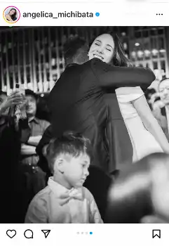 「写真は去年、結婚パーティーを行ったときのもの またUPします」と説明。「長男は写真タイムになるとすぐ後ろに逃げます」と親子ショットも添えた。
