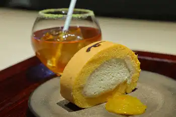 藤井は「ミルクジャムと柑橘のロールケーキ」と「ベルガモット和紅茶」、「国産バレンシアオレンジジュース」とアイスコーヒーを注文した。
