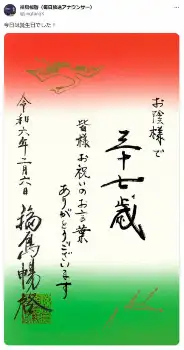 そして祝福コメントに対し、「お陰様で三十七歳 皆様お祝いのお言葉ありがとうございます 令和六年二月六日 福島暢啓」と筆文字で書かれたお礼状を掲載した。