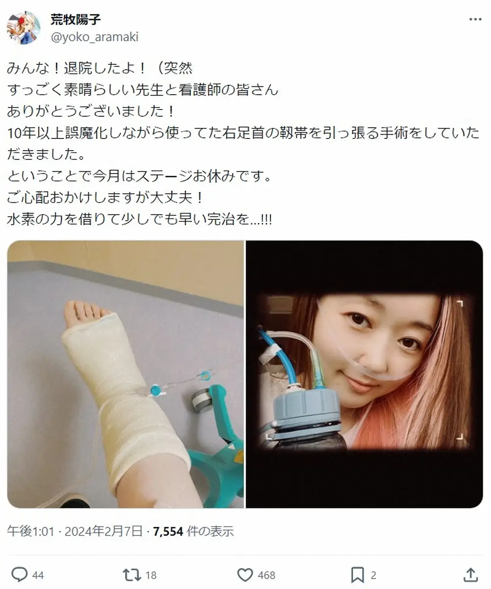 6月までコンサートの予定がびっしり埋まっている荒牧だが、2月の公演は1つも発表されていなかった。「ということで今月はステージお休みです。ご心配おかけしますが大丈夫!」と、今回の手術によるものだったと明かし「水素の力を借りて少しでも早い完治を…!!!」とつづった。