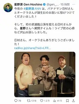シンガー・ソングライターの星野源(43)が6日深夜、パーソナリティーを務めるニッポン放送「星野源のオールナイトニッポン」に出演。1月28日に43歳の誕生日を迎え、ゲスト出演したバナナマンの日村勇紀(51)から祝福された。