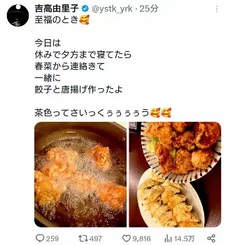 俳優の吉高由里子(35)が7日、自身のX(旧ツイッター)を更新し、親友と一緒に餃子と唐揚げを作ったことを報告した。