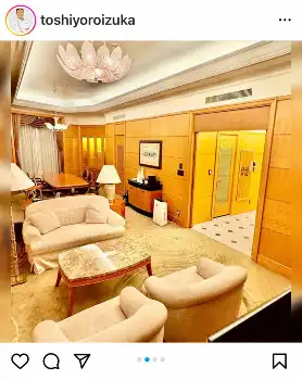 「もう~、絶対にあかんぞ~。図に乗ったり勘違いしたら ってかもう完全に勘違いして図に乗ってる」と自らにツッコミを入れた鎧塚氏。豪華な部屋でくつろぐ自身の姿を公開し、「昨晩遅くに横浜のホテルにチェックインしたら何故だかUP↑UP↑UP ↑グレードされて、この部屋、最高級スイートルーム」と驚きの展開を明かした。