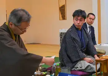 午前8時45分、挑戦者の菅井が入室。藤井は50分に姿を見せ、対局1日目の指し手を再現した。