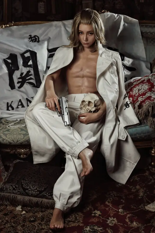 「衣装について、関東卍會の白い特攻服のカッコ良さや作中最後の圧倒的な強敵感を出す為に合皮の素材のコートを改造し、オーダーした刺繍のワッペンを付けて製作しました。