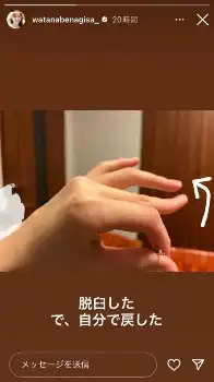 体調不調で昨年7月から休養中のフジテレビ渡邊渚アナウンサー(26)が8日に自身のインスタグラムのストーリーズを更新。指を脱臼し、自力で治したことを明かした。