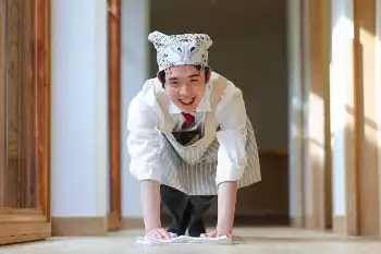 今期最後の勝者の記念撮影。王将3連覇を決めた対局会場で将棋盤を磨き、床を雑巾掛けしてみた。「立つ鳥跡を濁さず」。その心境に至った藤井はこの上なくうれしそうに「雑巾掛けはたぶん小学生以来。将棋盤を拭くのも奨励会時代以来です」。対局中とは真逆の全身をフル活用した撮影。童心に返った王将の笑顔がはじけた。