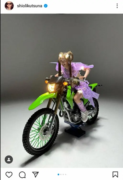 「ネオフェアリーセーラームーン」とつづり、金髪ツインテール姿で、緑色のオフロードバイクにまたがっている写真などアップした。