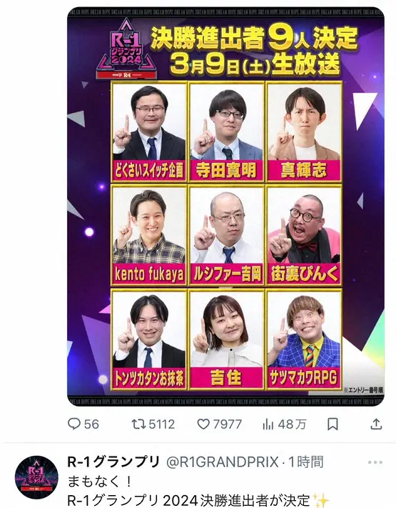 ピン芸人日本一を決める「R―1グランプリ2024」の決勝進出者9人が発表となり、アマチュア芸人「どくさいスイッチ企画」が決勝進出を果たした。