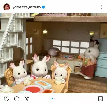 横澤は「やだ!洗い物が多いわね!」とコメント。シンクに食器が山積みになった、動物の人形で作られたドールハウス「シルバニアファミリー」の写真を掲載した。
