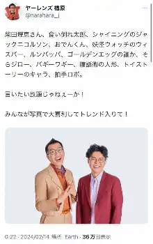 これに対して楢原は自身のXで「柴田理恵さん、食い倒れ太郎、シャイニングのジャックニコルソン、おでんくん、妖怪ウォッチのウィスパー、ルンパッパ、ゴールデンエッグの誰か、そらジロー。バギーワギー、腹話術の人形、トイストーリーのキャラ、拍手ロボ。言いたい放題じゃねぇーか!みんなが写真で大喜利してトレンド入りて!」とツッコんだ。