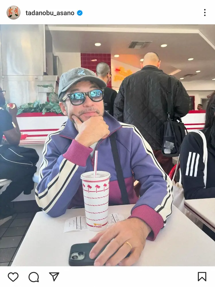 浅野は「インナンナウトバーガー食べました!」とコメント。ドジャースの大谷翔平選手が、ファン感謝イベントで"好物"として挙げたハンバーガーショップでの写真を掲載した。
