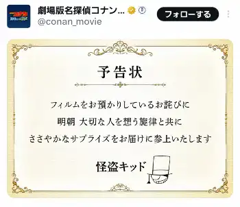 前日14日には劇場版名探偵コナンの公式Xが、今作に登場する人気キャラクター・怪盗キッドからの「フィルムをお預かりしているお詫びに 明朝大切な人を想う旋律と共に ささやかなサプライズをお届けに参上いたします 怪盗キッド」とする予告状を公開。SNS上では「もしかして主題歌発表?」「楽しみ」との声とともに、予想が白熱していた。