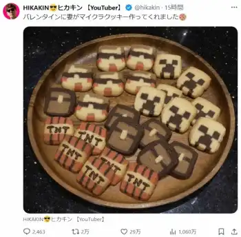 ヒカキンは「バレンタインに妻がマイクラクッキー作ってくれました」とつづり、人気ゲーム「マインクラフト」をモチーフにした4種類の手作りクッキーをアップした。