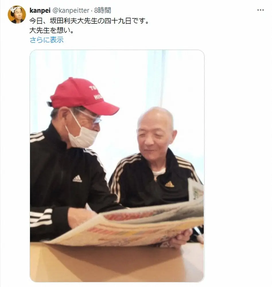 「今日、坂田利夫大先生の四十九日です」とつづると、黒のジャージに赤のキャップ、マスク姿で新聞を手にした自身と黒のジャージ姿の坂田さんの2ショットをアップ。