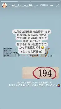 昨年11月に第1子妊娠を公表した岡副。インスタグラムでも妊娠中の様子を公表してきたが、この日、「10月の血液検査で血糖が118で再検査になったんだけど今回の妊娠後期の検査で血糖194という信じられない数値がきてかなり動揺してる(もちろん再検査)」として、実際の数値を公開した。