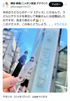 これを受けて番組アシスタントの熊谷実帆アナウンサーが自身と有働アナのアクスタを業者に発注し、この日の番組でお披露目した。有働アナは「こんなのもできるんですね。世界で一つですね!」と興味を示すも、3600円という値段を聞くと「高っ!」とビックリ。「3600円で作ってくれはったんやけど、何がええの?これ」と実物を前にしてもアクスタの楽しさが理解できない様子。