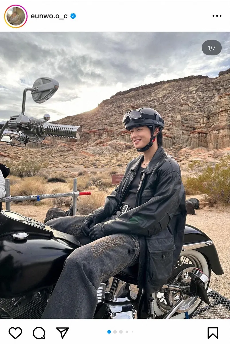 レザージャケットにヘルメット、ゴーグル、などワイルドな“ライダー”スタイルでバイクにまたがるチャ・ウヌは、優しい笑顔を浮かべている写真を投稿。