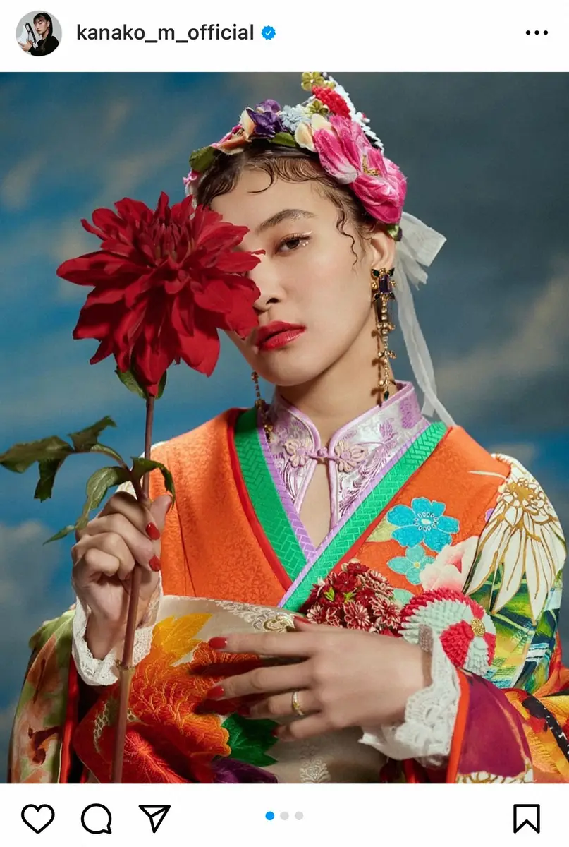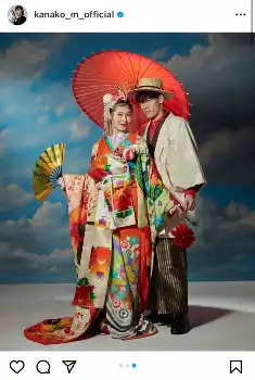 村上は「#パート3」「#和装」とつづり、赤を基調に花柄が描かれたド派手な着物姿をアップ。和服に帽子をコーディネートした婚約者の“豊さん”との2ショットも公開した。